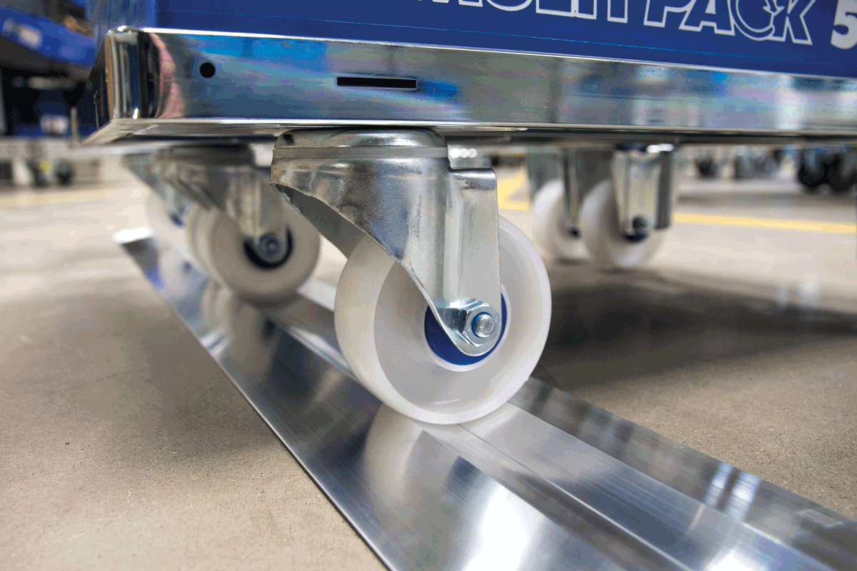 In der Fertigung und Montage ist es erforderlich, Bauteile von einem Ort zum anderen zu transportieren. Die Materialbereitstellung geschieht in der Regel mithilfe von Gabelstaplern und Europaletten. Das Rangieren vor dem Regal und Schieben der Paletten erfordert viel Platz auf der Fläche und bietet nur wenig Flexibilität. Mit einem Bodenroller lassen sich Material, Bauteile oder Zubehör ganz leicht von einem zentralen Ort im Raum zu Ihrer Fertigungs- oder Montagelinie transportieren.