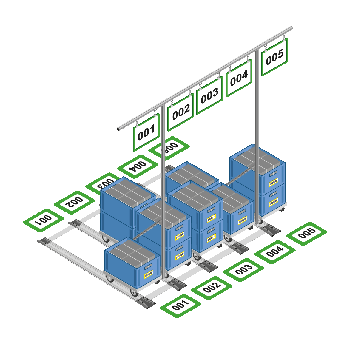 Das FIFO-Prinzip hilft dabei, die Materialbereitstellung zu optimieren. FIFO-Bahnhöfe sind als Teil der Kanban-Bereitstellung "Supermärkte" für Bodenroller und Materialwagen. Das bedeutet, dass Ihre Mitarbeiter in der Produktion oder Fertigung im Rahmen des Regelkreises die entsprechenden Materialwagen oder Bodenroller aus dem FIFO-Bahnhof entnehmen oder diese hineinfahren.