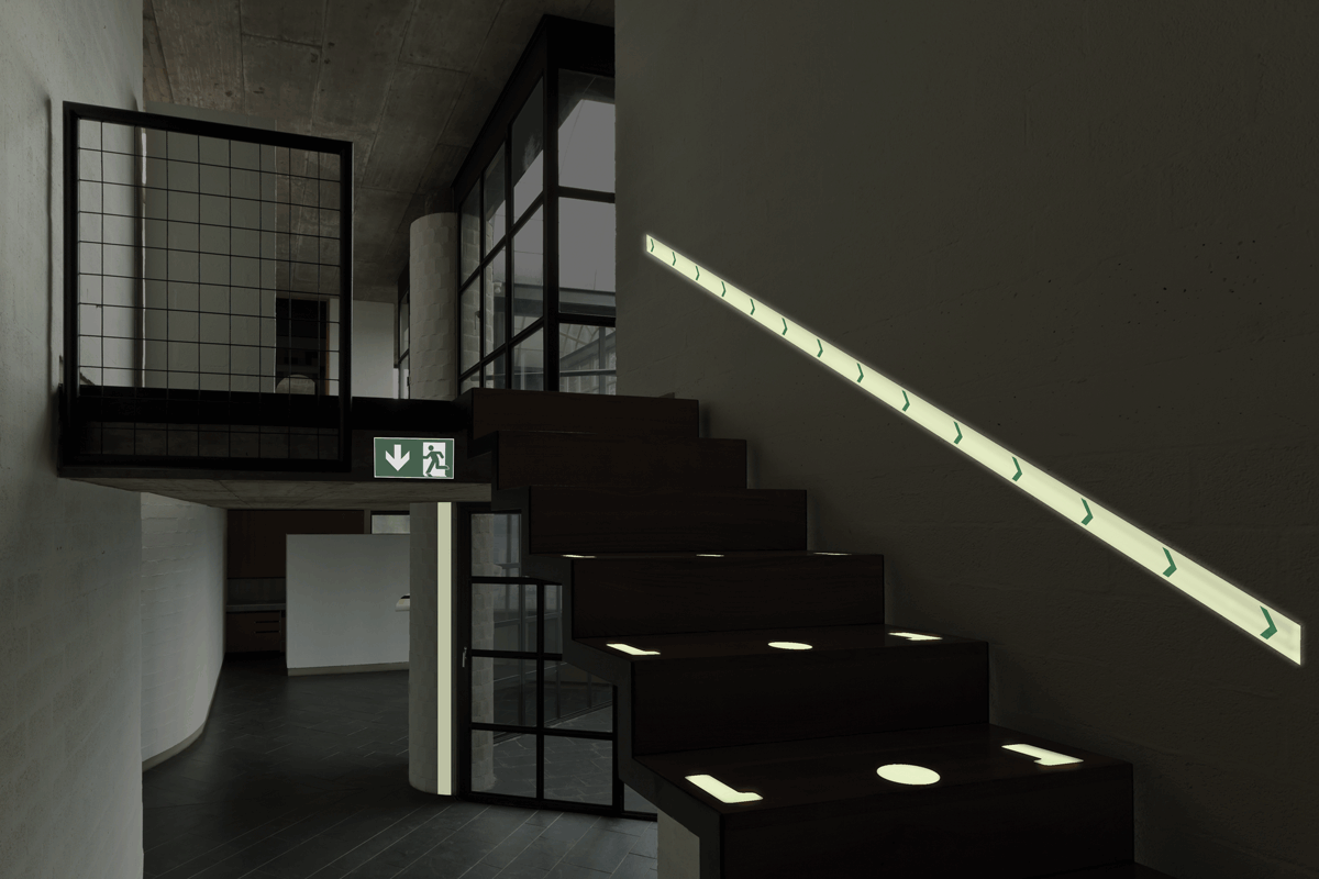 In Bereichen, in denen keine Sicherheitsbeleuchtung installiert ist oder auch nicht angebracht werden kann, sind langnachleuchtende Bodenmarkierungen und Beschilderungen an Wänden und Boden zwingend erforderlich, die im Notfall auch in der Dunkelheit eine Flucht aus dem Gebäude ermöglichen.