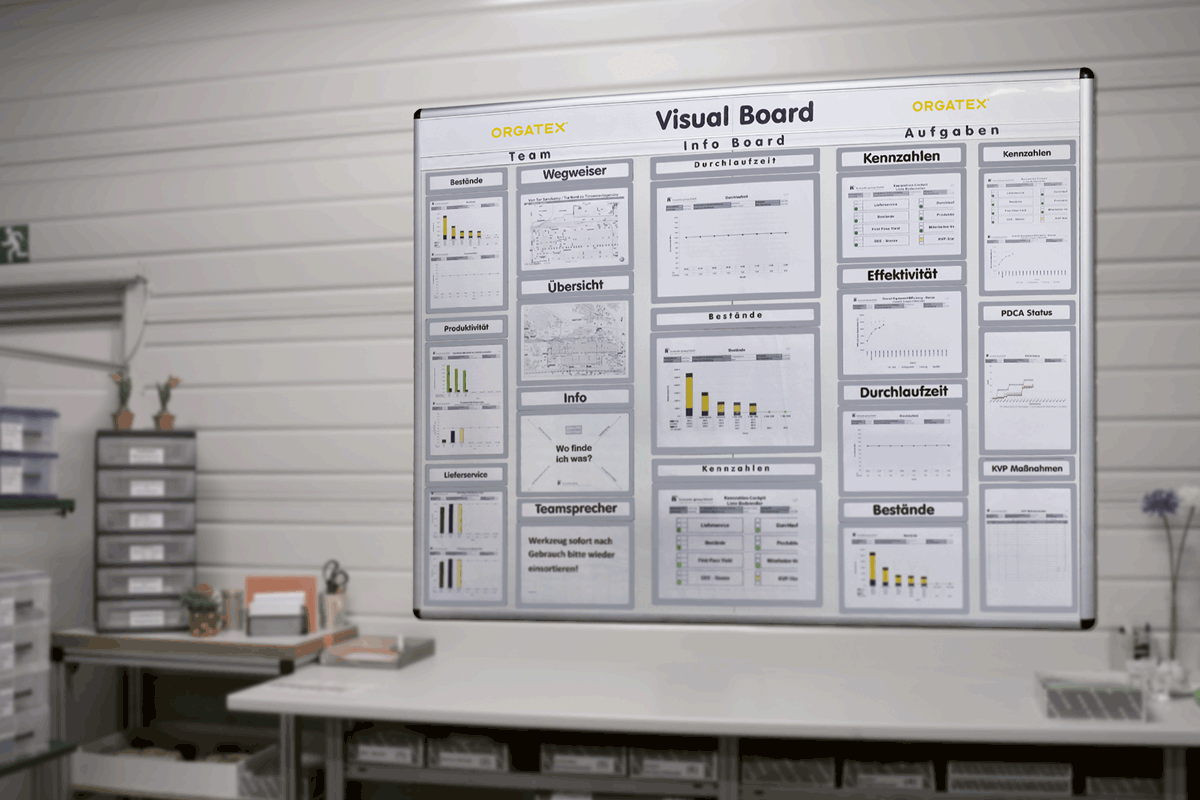 Visualisieren Sie Kennzahlen, Soll- und Ist-Zustand Ihrer Produktion, Leistung oder Maschinenlaufzeiten schwarz auf weiß - mit unserem Wandboard werden Informationen sichtbar und können unkompliziert herangezogen werden. Das sorgt für einen reibungslosen Ablauf in Ihrem Betrieb und schnelle Reaktionen und Sicherheit im Vorgehen bei auftretenden Problemen.