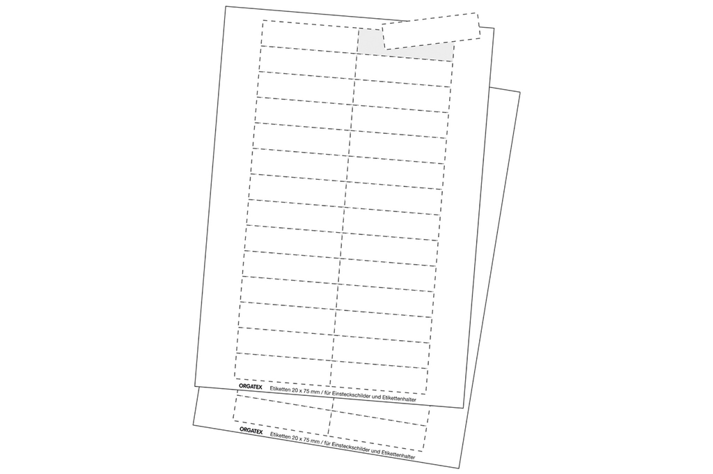 The ET33-75K-02 labels were carefully designed for robustness and ease of use in dynamic environments. Measuring 33 x 75 mm (H x W), they fit into various organizational systems and are available in a clean white color for legible printing. Pre-perforation simplifies label application. The A4 format of the cardboard insert allows for easy labeling in the printer. The cardboard insert is the perfect complement to Orgatex's visual management products, such as whiteboards, magnetic boards, and document holders.