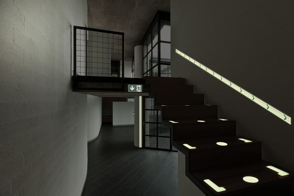 ORGATEX offers photoluminescent markings+* that are ideal for escape routes, rescue routes, and any area where reliable orientation is required in low-light conditions. These photoluminescent markings are perfect for lighting stairs in poorly lit stairwells, for example, or after store closing times to save energy. They prevent tripping hazards by reliably marking steps, landings, and uneven surfaces. Thanks to their high luminosity ([200/25 mcd/m2 according to DIN 67510)] and long afterglow time, they offer maximum safety. The markings adhere to a wide variety of surfaces** and are particularly durable and abrasion-resistant thanks to their robust construction. They are suitable for use in industrial halls, warehouses, and other areas where safety must be guaranteed even in dark conditions. Their easy installation and maintenance-free operation make them an efficient addition to any security concept.