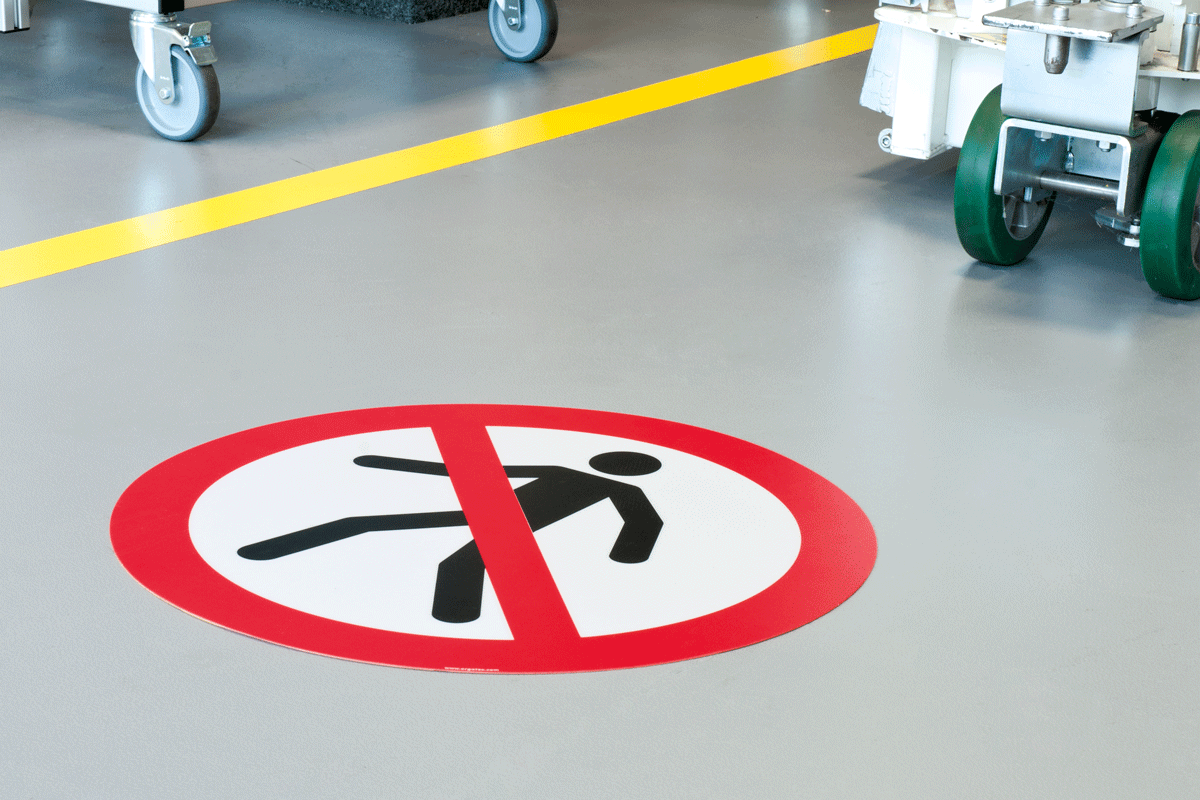 Farbcodierte Bodenmarkierungen und Plakatrahmen für Sicherheitsanweisungen.