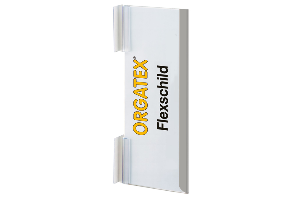 FlexLabel ist ein flexibler, selbstklebender Etikettenträger von ORGATEX zur klaren Regal- und Behälterkennzeichnung, ideal für Lager, Produktion und Versand.