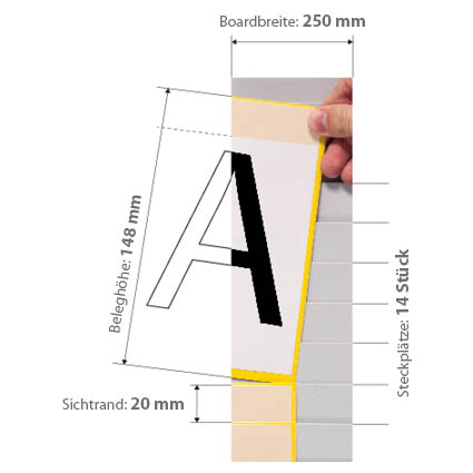 Die Tafel misst 440 x 250 mm (H x B), hat einen 20 mm Sichtrand, eine Beleghöhe von 148 mm und eine Einstecktiefe von 128 mm. Insgesamt stehen 14 Steckplätze zur Verfügung; die Basis bildet ein pulverbeschichtetes Greyboard mit hellgrauen Einsteckschuppen.