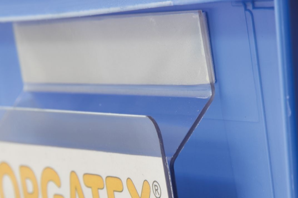 Die gewinkelte Form ist speziell für die Aufnahme an KLT-Kanten und schmalen Behälterfronten entwickelt und verbessert die Sichtbarkeit von Dokumenten im Regal.