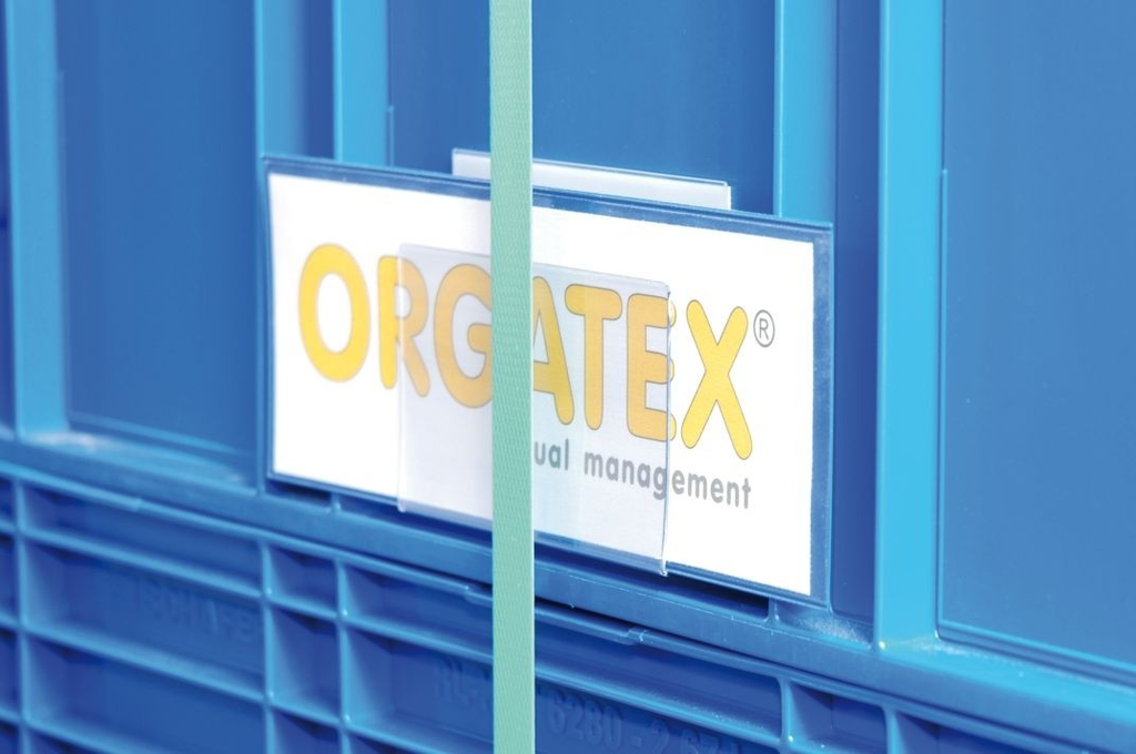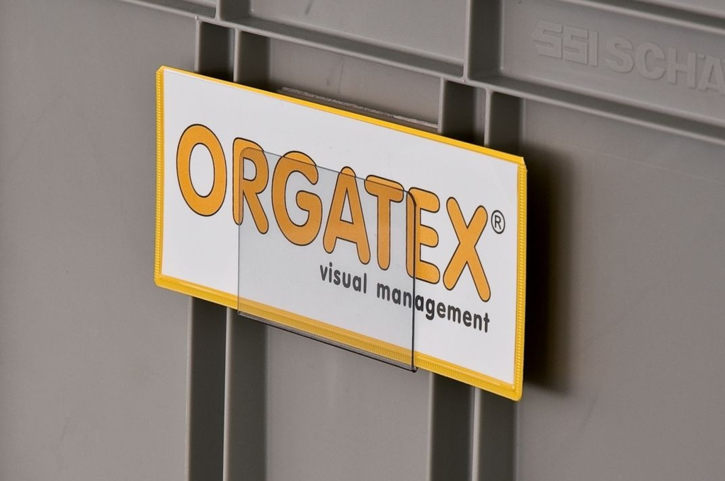 Beleghalter (Kanban-Cover) von ORGATEX, selbstklebender, gewinkelter Etikettenhalter für KLT und Behälter