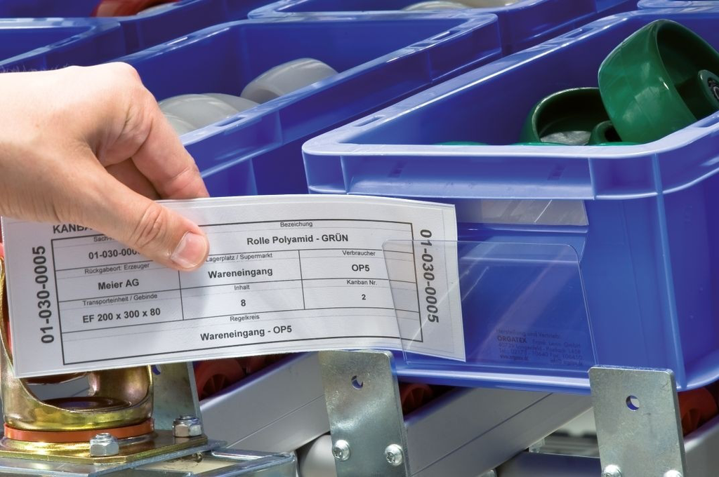 Der Beleghalter sorgt dafür, dass Arbeitsbelege, Kanban-Karten und Etiketten am Behälter immer sichtbar bleiben. Die transparente Hart-PVC-Abdeckung schützt vor Schmutz und Feuchtigkeit, gleichzeitig ist die Oberfläche für Barcode- und QR-Scanner optimiert. Das reduziert Suchzeiten und Fehlerquellen bei der Teileversorgung.