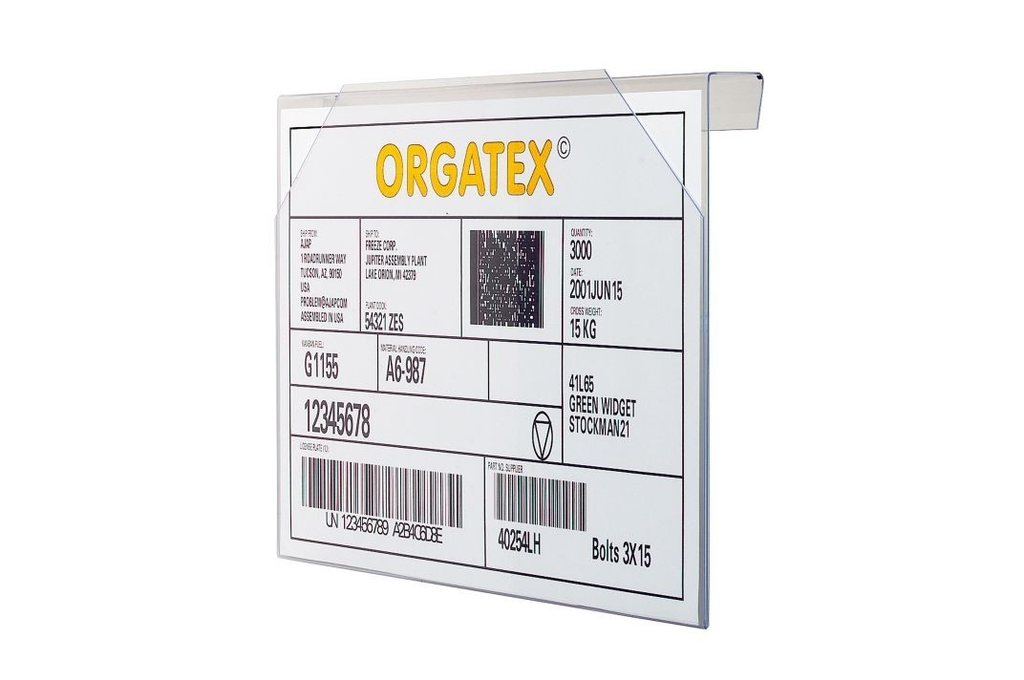 Der Beleghalter Kanban-Cover von ORGATEX ist ein transparenter Hart-PVC-Überhänger in DIN A5 quer zur sicheren Kennzeichnung von KLT, Behältern und Regalen.