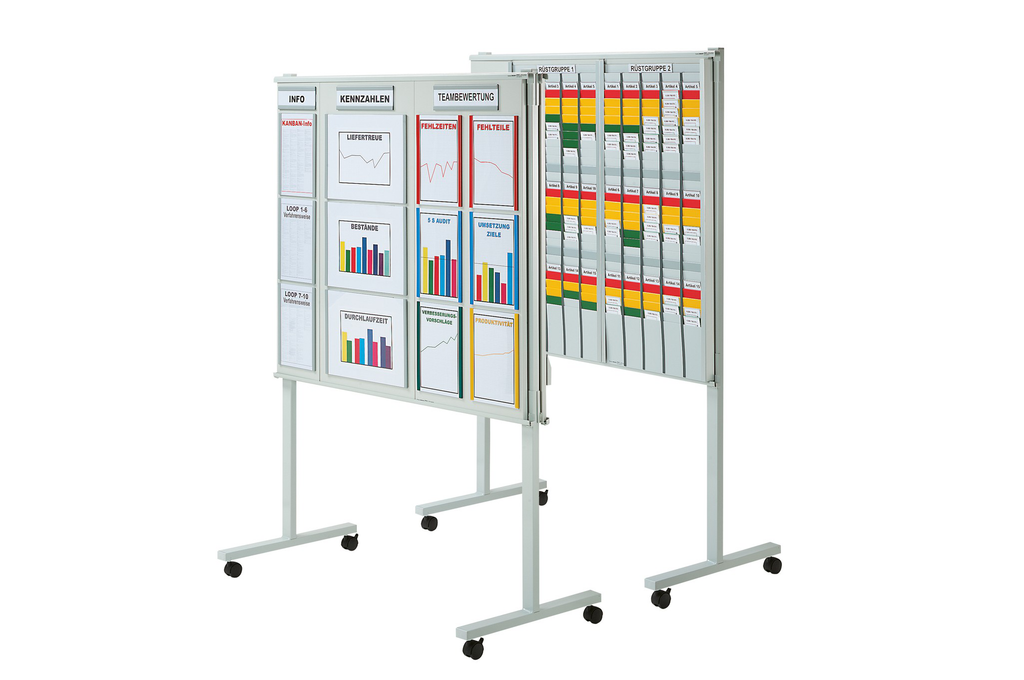Die Konstruktion aus Stahl mit pulverbeschichteter Oberfläche ist beständig gegen Kratzer und Schmutz und hält dem täglichen Betrieb stand. Die beidseitige Nutzung verdoppelt die Informationsfläche, wodurch Abläufe kompakt dokumentiert und Standardarbeitsanweisungen sauber präsentiert werden.