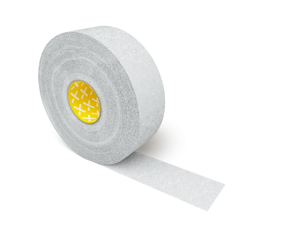 Die LGGRIP75-02 von ORGATEX, Bodenmarkierung wird selbstklebend verlegt; bei schwierigen Untergründen empfiehlt sich Primer und ein Andruckroller für langfristige Haftung.