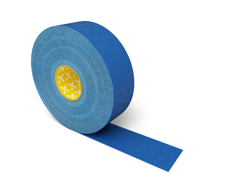 Die Longlife Grip - Bodenmarkierung LGGRIP75-07 ist selbstklebend; ORGATEX empfiehlt Reinigung des Untergrunds, bei Bedarf Primer und das Andrücken mit einer Andruckrolle für optimale Haftung.