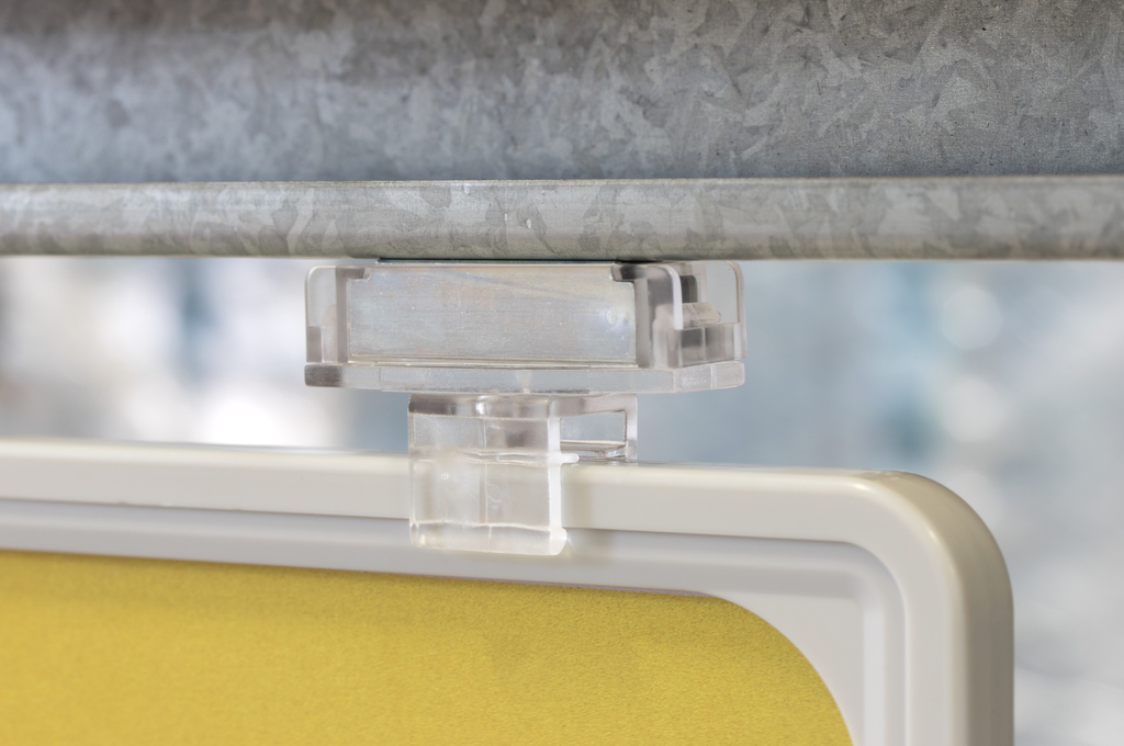 In Kombination mit unserem umfangreichen Zubehör lässt sich der Plakatrahmen vielseitig anbringen – ob an Regalen, Wänden, Kisten oder Maschinen.