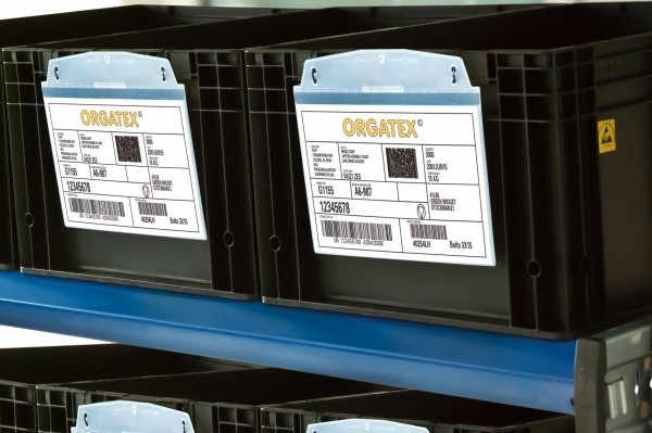 Die SD018-ESD-03 von ORGATEX ist in der Ausführung zum Anhängen mit Schlitzstanzung konzipiert und kann mit Drahtbügeln oder Klammern an Behältern und Gittern montiert werden.