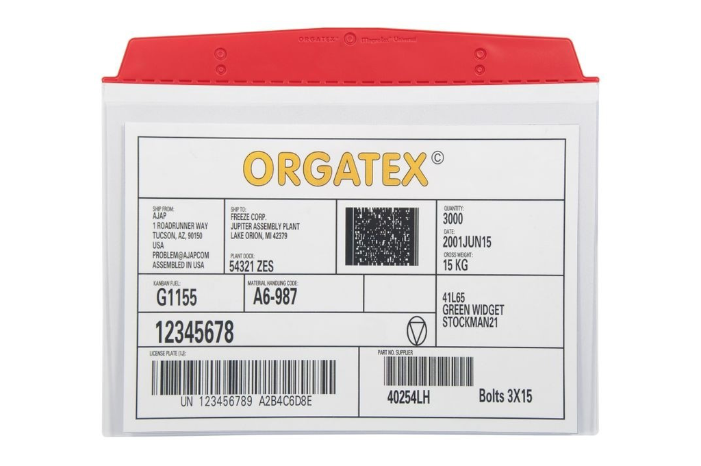Durch das klare Fenster bleiben Belege sichtbar und Barcode- sowie QR-Codes sind problemlos scannbar. Farbiges Kopfteil ermöglicht sofortige Zuordnung und reduziert Suchzeiten sowie Fehlgriffe im Materialfluss.