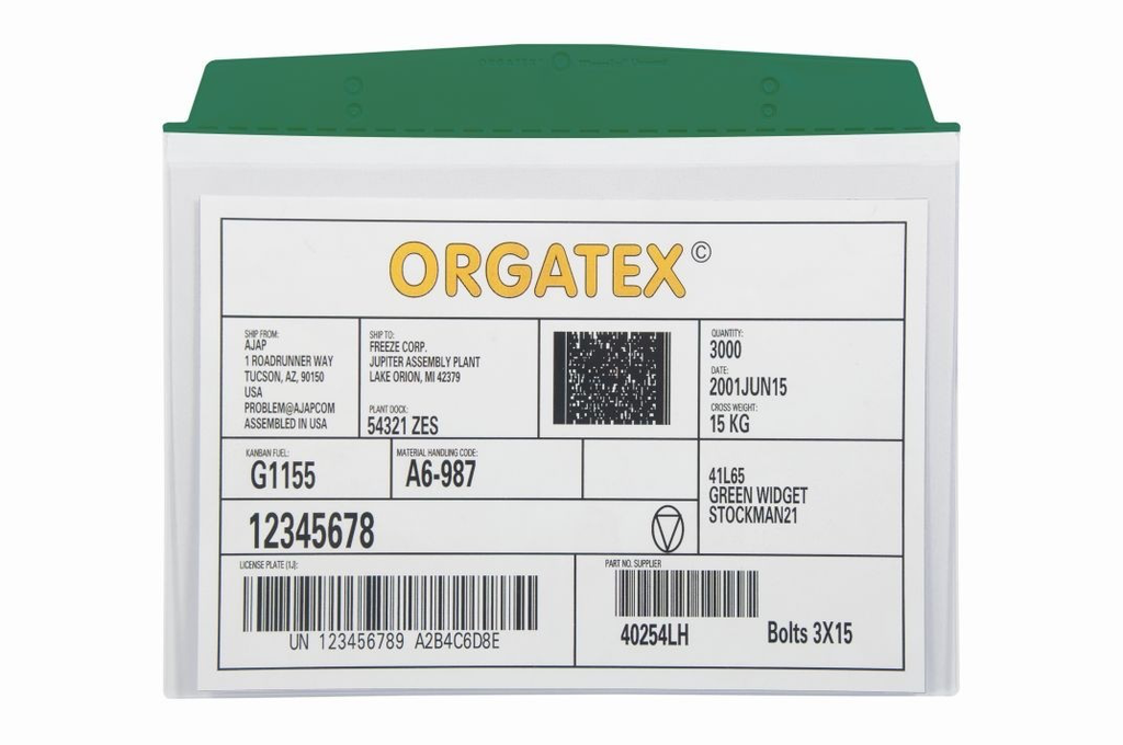 Die Sichttasche SD020-ESD-05 von ORGATEX schafft sichtbare Kennzeichnung an Behältern, reduziert Suchzeiten und erleichtert durch farbige Kopfteile eine visuelle Steuerung von Prozessen.