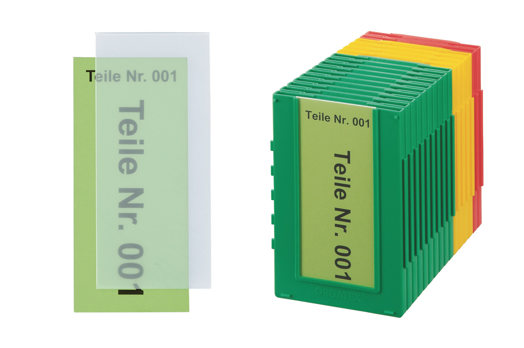 Einsteckschild für Systemboxen. Klare Zuordnung z.B. von Artikelnummern. Bei verschuppten Systemboxen dient das Schild als Abschluss für die letzte Box.