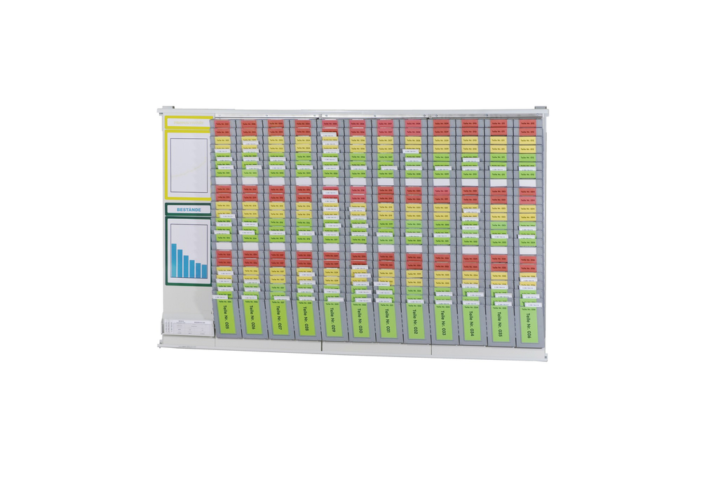 Kanban-Boards dienen der Steuerung von Produktionsabläufen. Durch Einsatz der Kanban-Methode erreicht man eine Reduzierung der Bestände und erhöht gleichzeitig die Lieferfähigkeit. Das Kanban-Starterset besteht aus einem Greyboard, Systemboxen, Einsteckschildern, Kartoneinlagen und Befestigungsmaterial. Bitte rufen Sie uns an, damit wir Ihr individuelles Board zusammenstellen können.