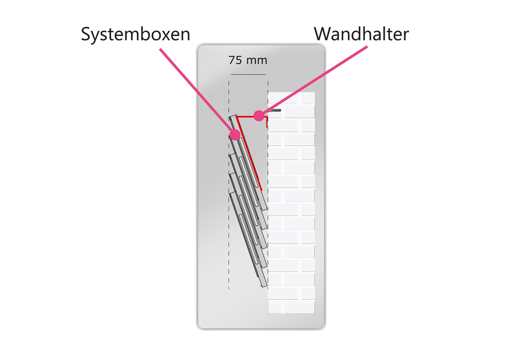Wandhalterung aus Edelstahl zur verschuppten Aufnahme von Systemboxen. Beliebig erweiterbar.