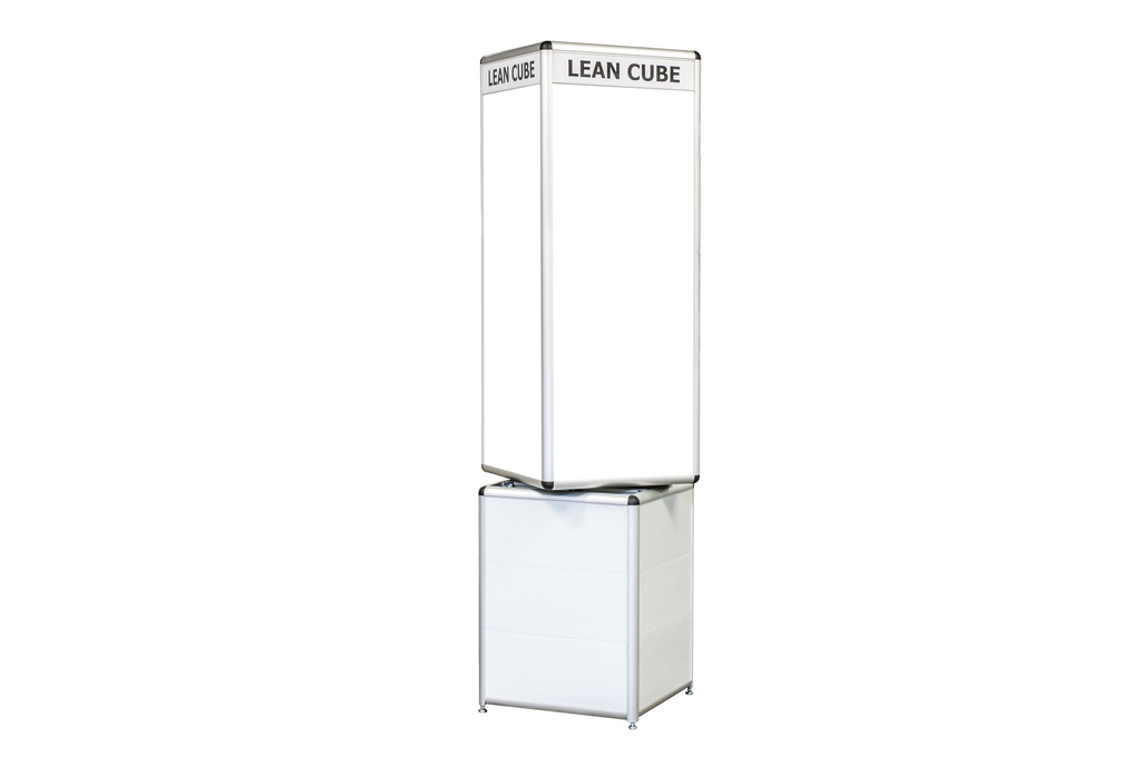 Der Lean Cube drehbar 700 ist eine drehbare Infosäule für die übersichtliche Darstellung von Kennzahlen, Arbeitsanweisungen und Teaminformationen in Produktion, Lager und Büro.