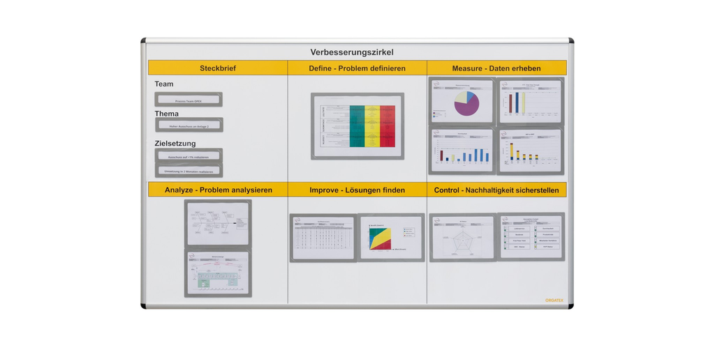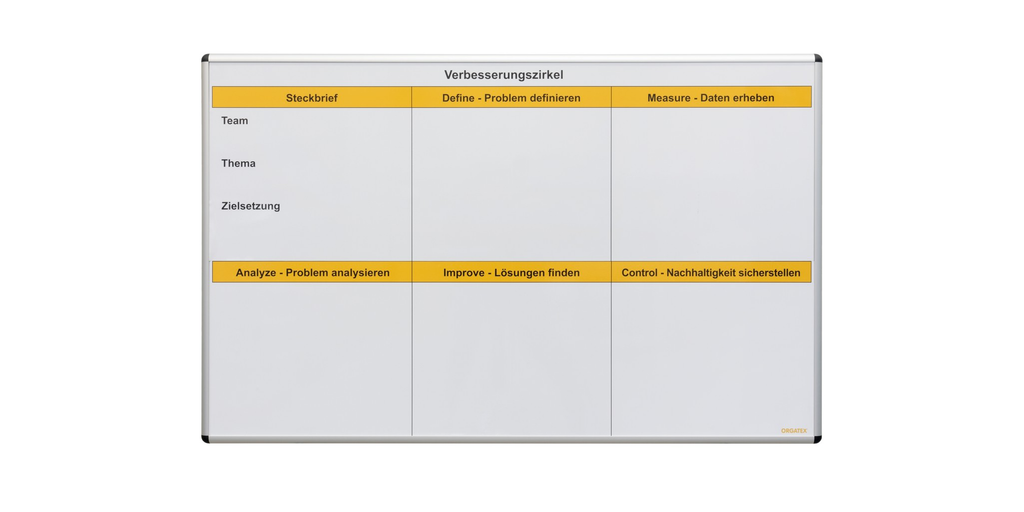 Probleme sollten nicht auf der Symptomebene, sondern an der Wurzel behoben werden – der Kernursache. Für die effiziente und gleichzeitig strukturierte Problemlösung bietet sich unser Board für den Verbesserungszirkel an. Die Vorgehensweise orientiert sich an der bekannten und etablierten DMAIC-Struktur und dient Mitarbeitern als Hilfestellung um nachhaltige Lösungen zu erarbeiten.